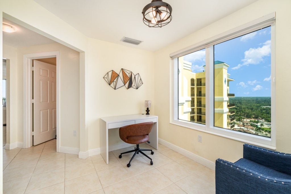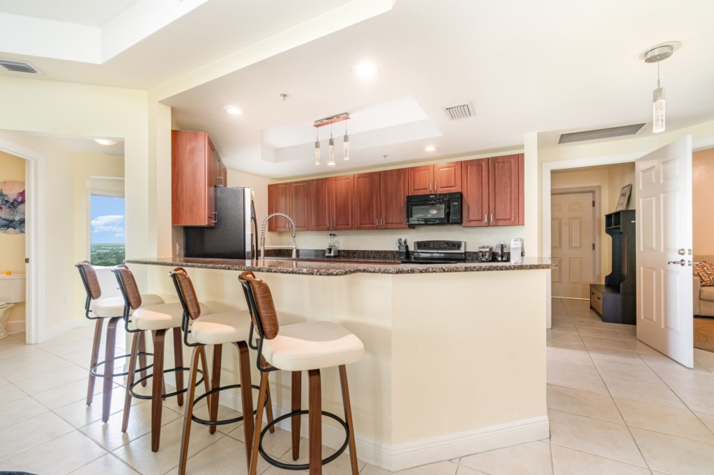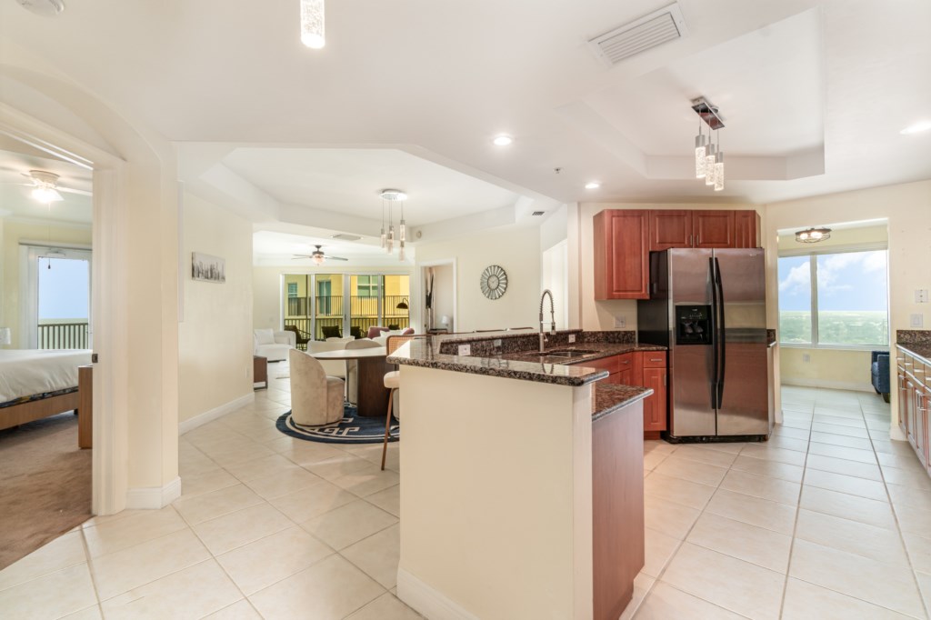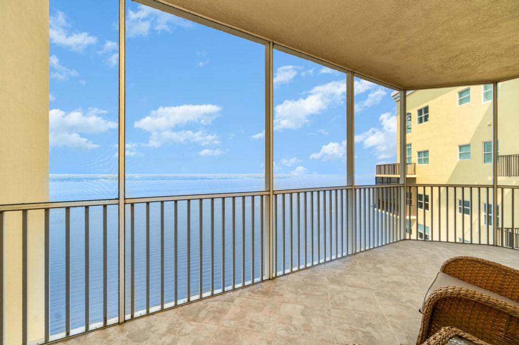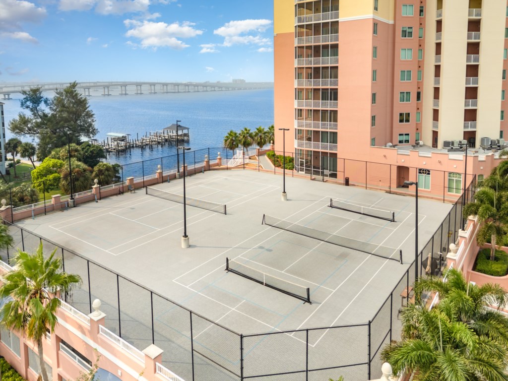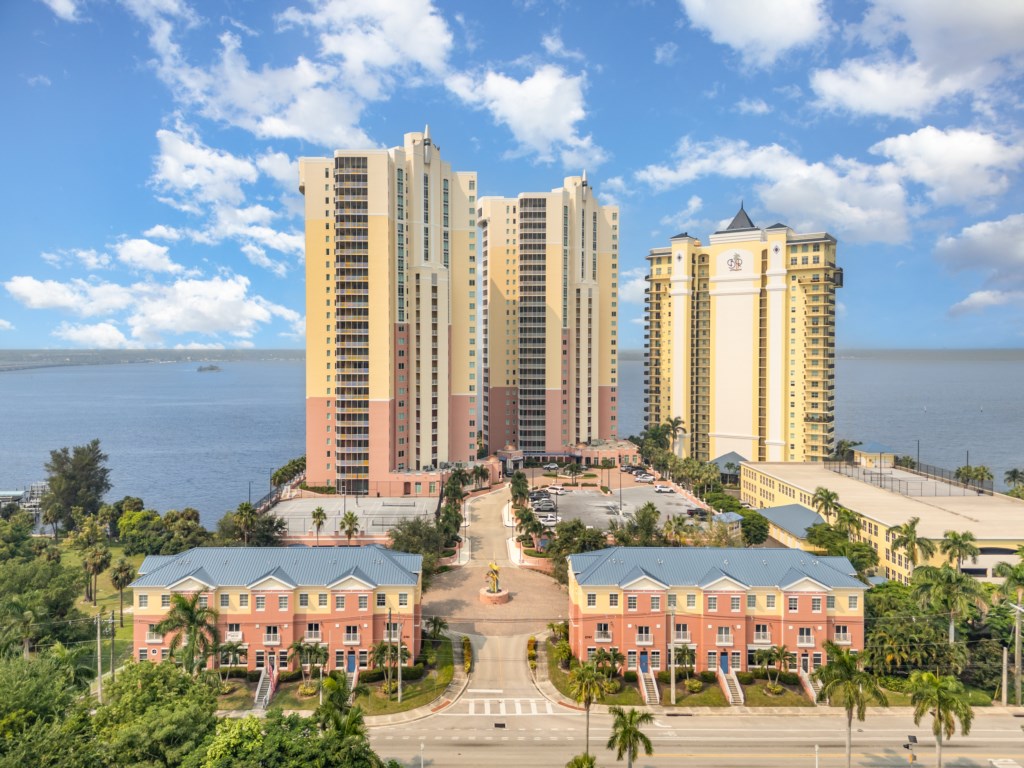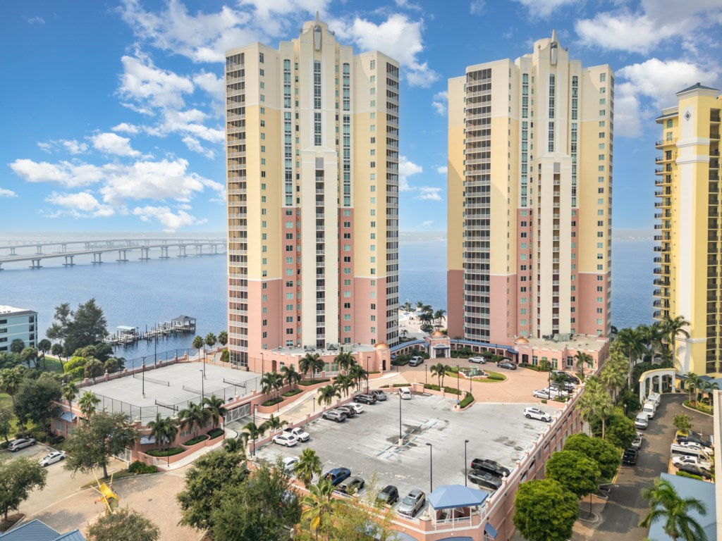 Wow! You will not be disappointed... Enter this beautiful end unit from your PRIVATE foyer and elevator. Endless River Views from the 21st Floor of the St. Tropez building. Your home in the sky includes a secure entry, stunning views, and a sought-after address in Fort Myer’s Downtown District with restaurants, events, and shopping nearby. Corner Unit - Featuring 2 bedrooms with King beds and a den/office (with a sleeper sofa for guests) and 2 full bathrooms with over 1,721 SF. Quality construction and upgrades set this unit apart with updated lighting, granite counters, tray ceilings, window coverings, and an open layout. The Corner End Unit gives you more windows for natural light and fantastic views, plus a wrap-around screened-in patio looking down the Caloosahatchee River and city skyline. There is a room off of the wash room that has a desk for a private work space. This exceptional condo is part of a prestigious community offering resort-style amenities such as a heated infinity-edge pool and spa overlooking the river and downtown Fort Myers skyline, tennis and pickleball courts, a well-equipped fitness center, a party room, a theater, and a library. Convenience is key with free trolley service to downtown and Publix from November 15th to May 15th, providing easy access to the Historic River District art center, riverfront amphitheater, music walk, art walk, diverse dining options, and shopping.