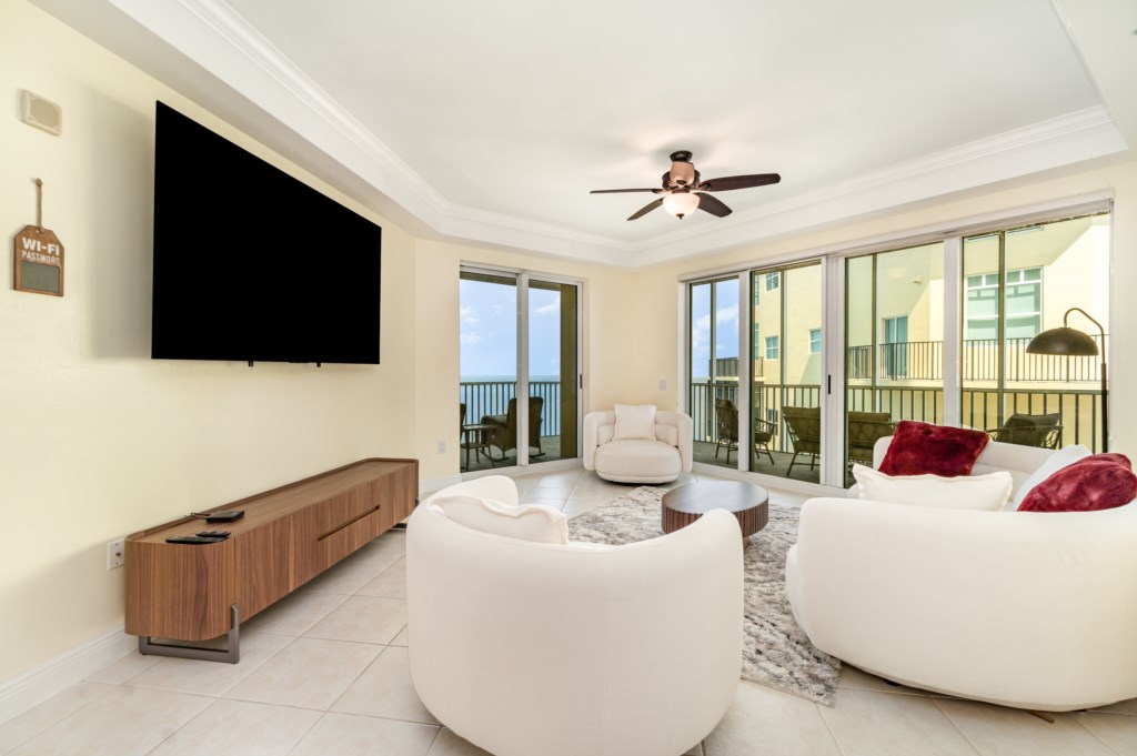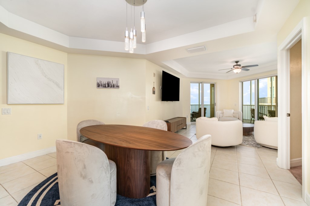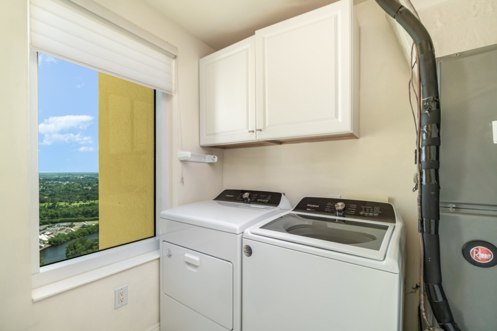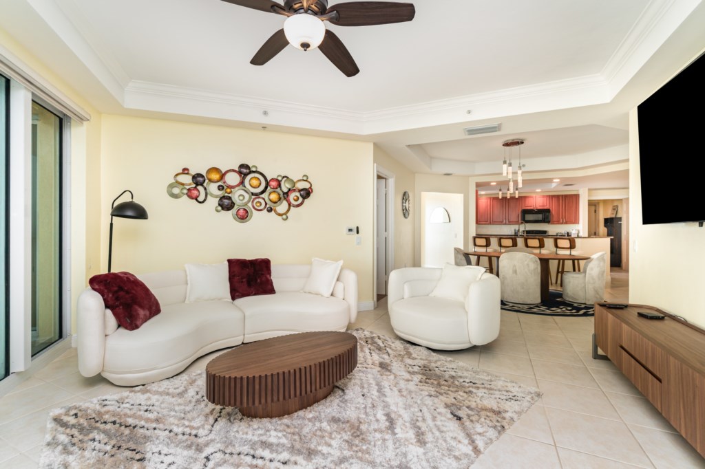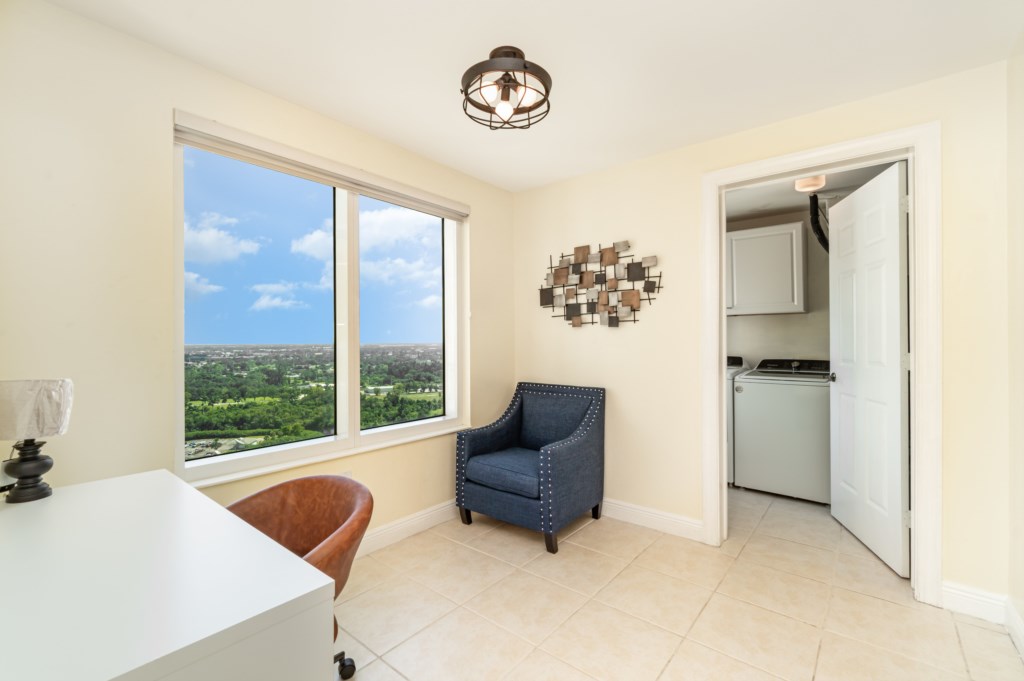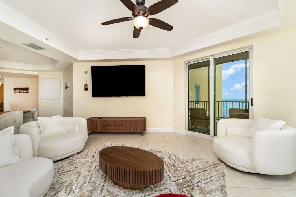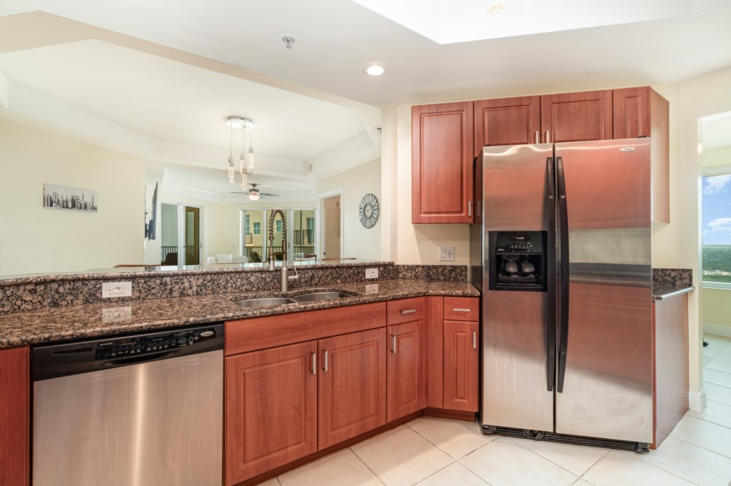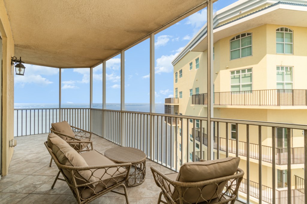 Wow! You will not be disappointed... Enter this beautiful end unit from your PRIVATE foyer and elevator. Endless River Views from the 21st Floor of the St. Tropez building. Your home in the sky includes a secure entry, stunning views, and a sought-after address in Fort Myer’s Downtown District with restaurants, events, and shopping nearby. Corner Unit - Featuring 2 bedrooms with King beds and a den/office (with a sleeper sofa for guests) and 2 full bathrooms with over 1,721 SF. Quality construction and upgrades set this unit apart with updated lighting, granite counters, tray ceilings, window coverings, and an open layout. The Corner End Unit gives you more windows for natural light and fantastic views, plus a wrap-around screened-in patio looking down the Caloosahatchee River and city skyline. There is a room off of the wash room that has a desk for a private work space. This exceptional condo is part of a prestigious community offering resort-style amenities such as a heated infinity-edge pool and spa overlooking the river and downtown Fort Myers skyline, tennis and pickleball courts, a well-equipped fitness center, a party room, a theater, and a library. Convenience is key with free trolley service to downtown and Publix from November 15th to May 15th, providing easy access to the Historic River District art center, riverfront amphitheater, music walk, art walk, diverse dining options, and shopping.