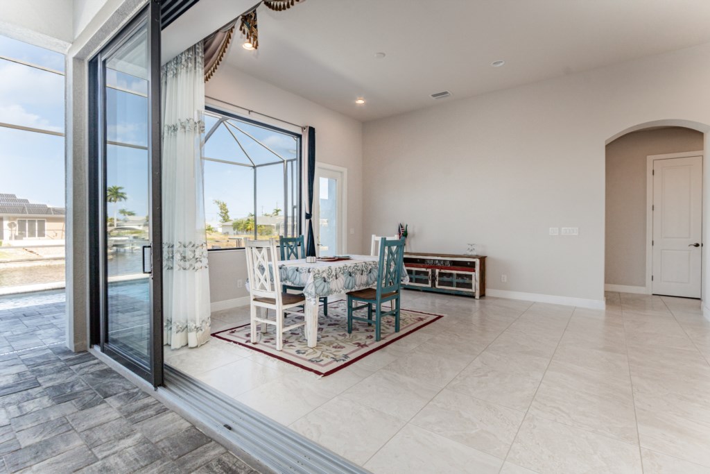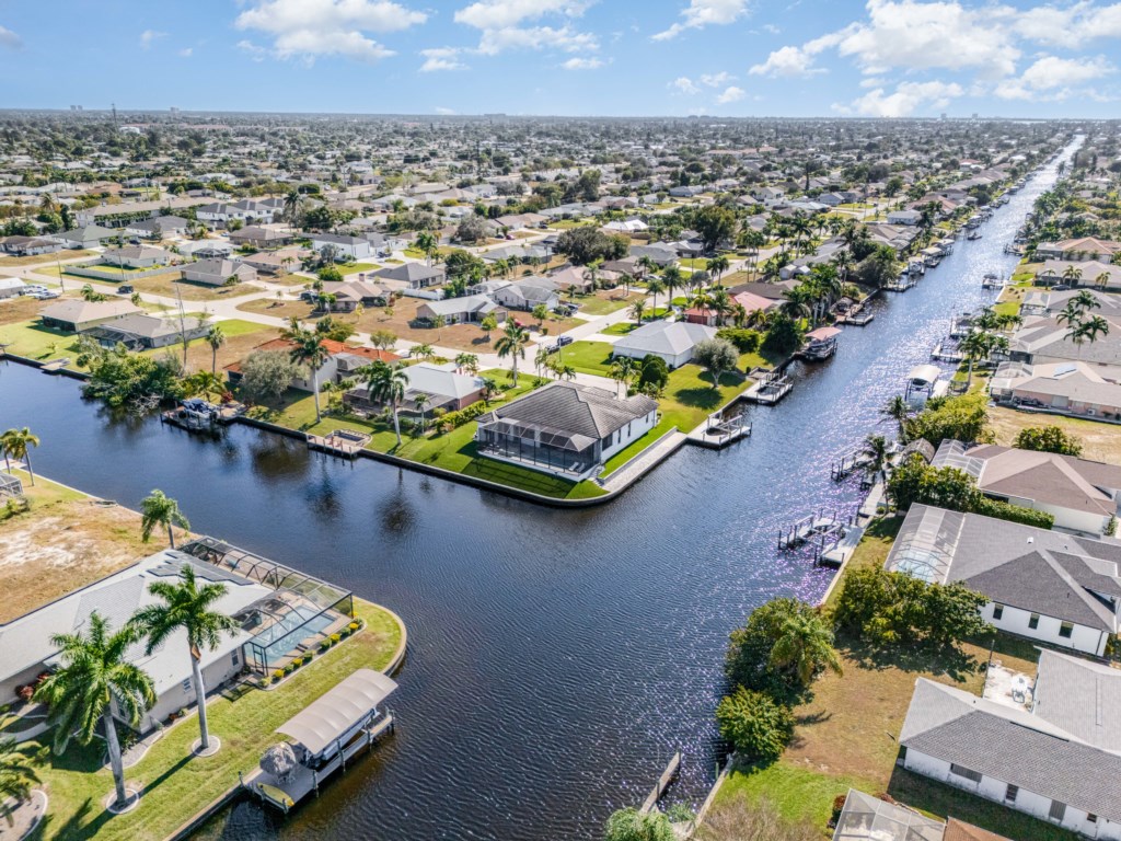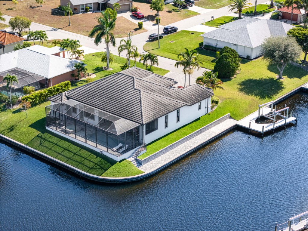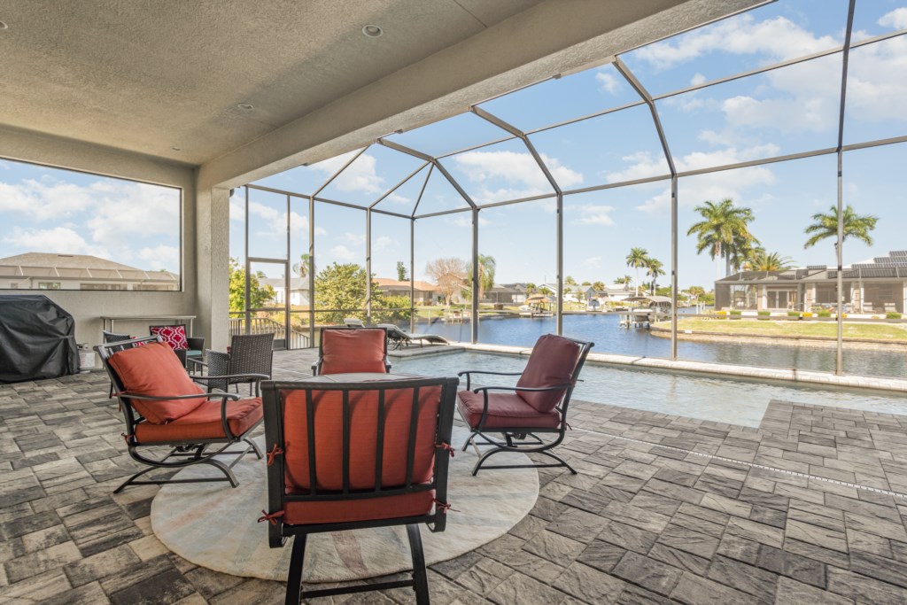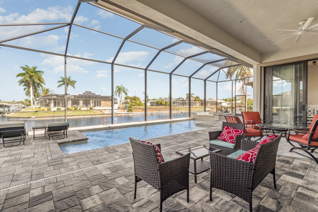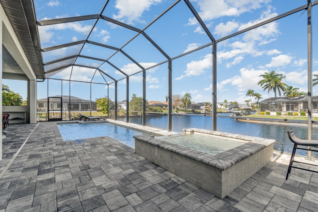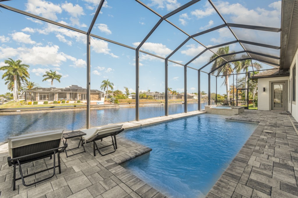 Regency meets the tropics in this new gem in the SW Cape on the intersection of two gulf access canals. This 2,642 sq. ft. waterfront dream home features a formal living room plus a large dining area with amazing water views. Lounge by the crystal clear heatable pool or pop into the hot tub for a peaceful soak. Grab a drink and fire up the BBQ for the ultimate Florida backyard living experience. Lounge out on the dock for wildlife viewing – right from your own backyard! Unwind in the luxurious tub in the master bath or rent a boat for an adventure over to Sanibel Island. Cozy up in front of one of the TVs to stream your favorite series. 3 bedrooms and 3 full baths sleep up to 6 people for a vacation you can enjoy with family and friends. Grab your slice of paradise and create lasting memories in this well-equipped, luxurious home in Cape Coral – Blue Haven! Pool/spa heat is $25/day or at a reduced rate for stays over 30 days.